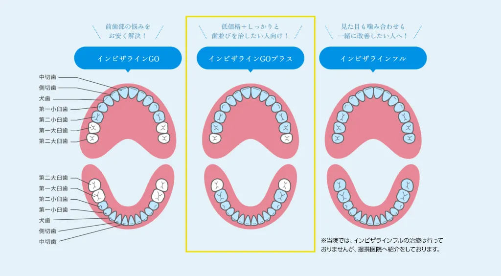 | インビザラインGo | インビザラインフル | ワイヤー矯正 | |